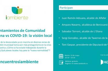 El tercer #encuentrosiambiente se traslada a los Ayuntamientos de la Comunitat Valenciana vs covid-19: la visión local. La cita para conectarse será el martes 19 de mayo a las 18:30 horas gracias al patrocinio en esta ocasión de Hidraqua. Para poder ver en directo el encuentro es preciso registrarse a través del formulario facilitado por iambiente.es.
