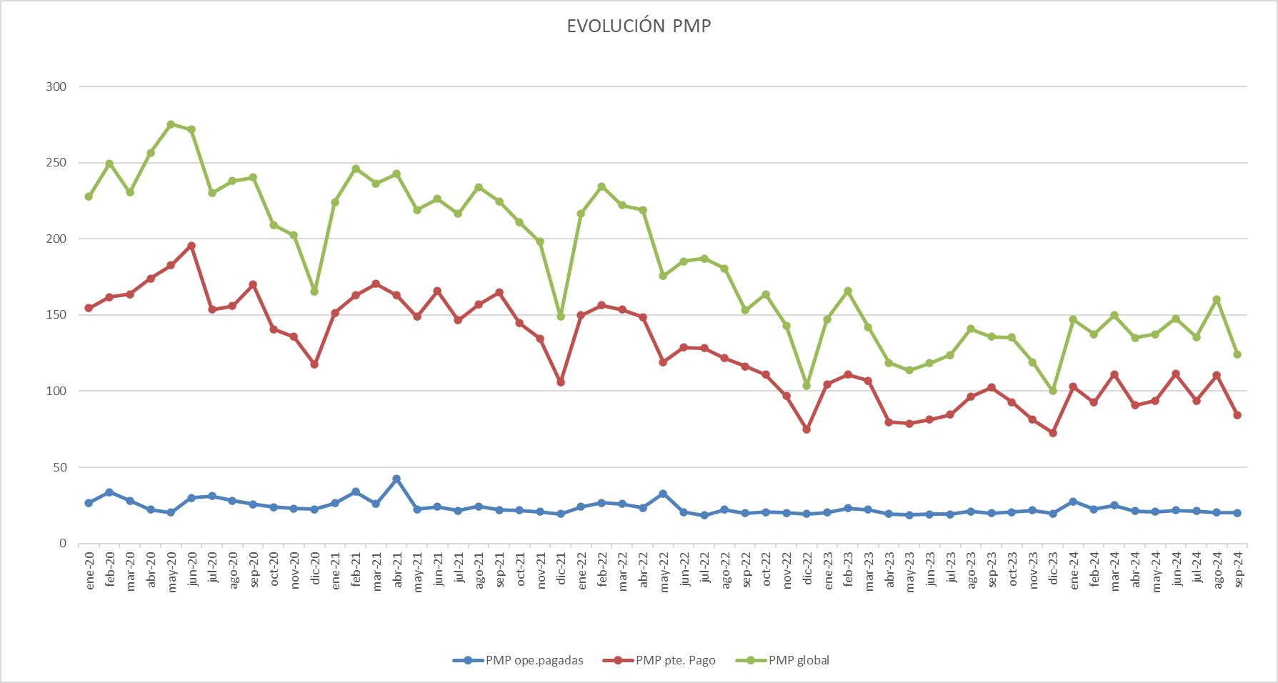 Se puede observar que la curva correspondiente al PMP de las operaciones pagadas (en azul) denota bajos períodos con carácter general, aunque puntualmente sobrepasan los 30 días, normalmente se sitúan en períodos inferiores.