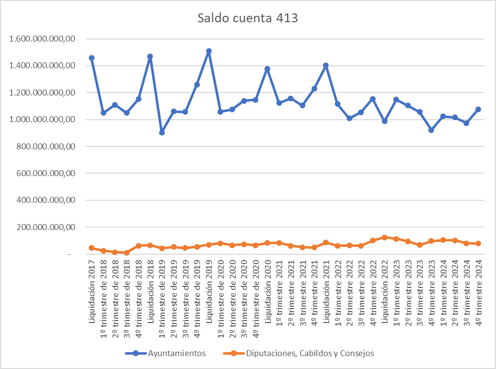 Se observa que los saldos en las diputaciones, cabildos y consejos insulares son bastante menores que en los ayuntamientos, lo que parece lógico, siendo además una línea muy continua, lo que demuestra la estabilidad de los saldos de la cuenta 413.